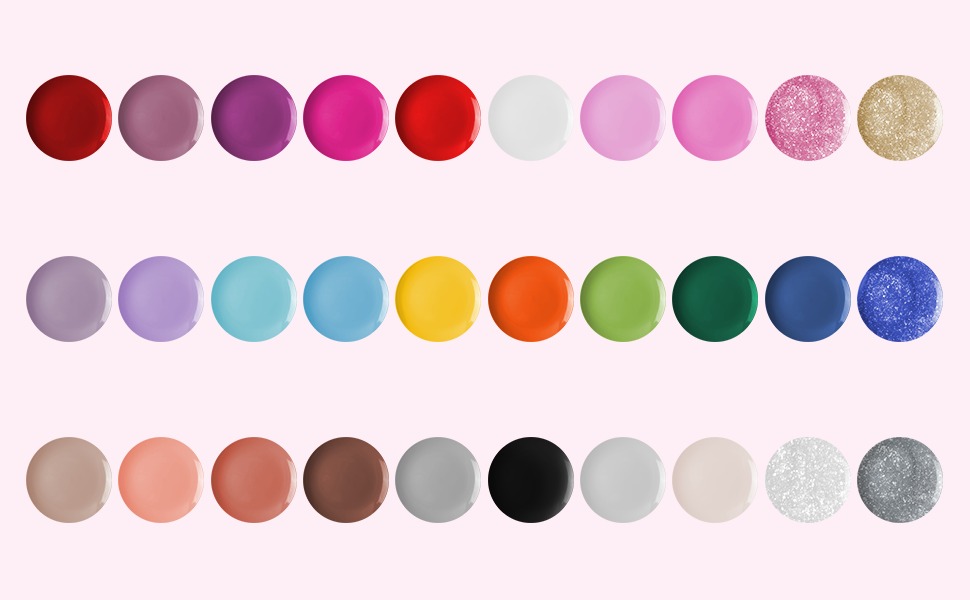 - 【Get 30 Beautiful Colors in one Set】This All Season Collection Gel Polish Kit contains 35PCS 0.17oz/5ml bottles:30 × solid colors gel/glitter gel, 2 × base coat,2 × glossy top coat, 1 × matte top coat provide the perfect finish. More than 15,000+ shades combos can be designed, suitable for party or professional application like wedding event, photoshoot, Party, Night out, daily Routine Use.