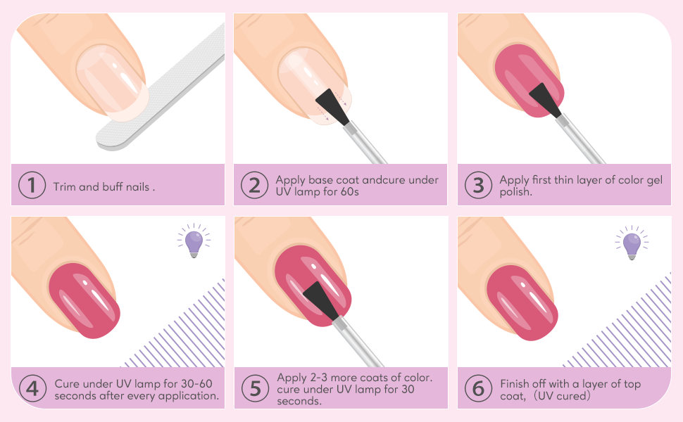 - 【Easy to Apply,2 Weeks+ Long Lasting】The U V Nail Polish set is easy to use with any LED/UV lamp. Curing takes 60-90 seconds for each coat, quick dry. They are all high in pigment so even only one application gives nice coverage and is very long-lasting because of special formula and advanced manufacture skills. It can keep the pastel nail gel glossy and shiny for more than 2 weeks under the proper application.